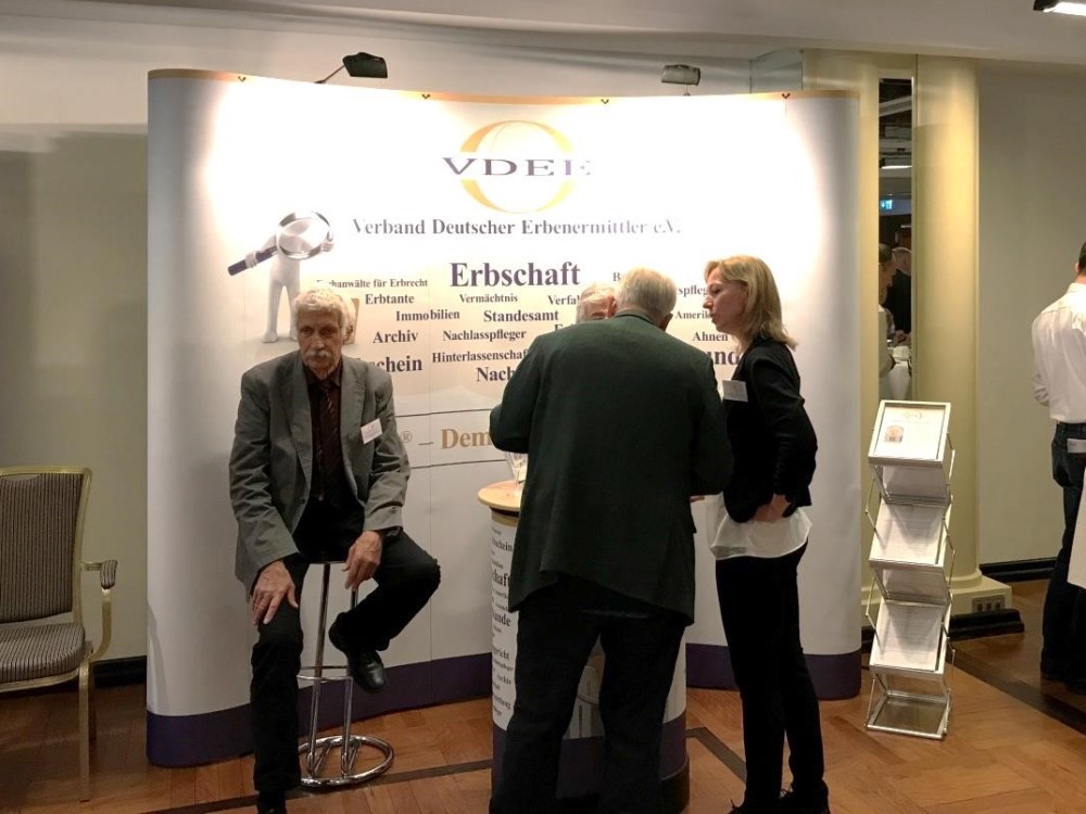 Zum ersten Mal präsentierte sich der Verband Deutscher Erbenermittler e.V. (VDEE) auf dem Deutschen Erbrechtstag 2017 in Berlin. Die Teilnahme stieß auf großes Interesse. Viele der Fachbesucher interessierten sich für unseren Verband und informierten sich über unsere Themen und Ziele. Und so war es eine gute Gelegenheit, den im Jahre 2010 gegründeten VDEE vorzustellen. Fragen zu den Mitgliedsunternehmen, aber auch die Ziele und Forderungen des Verbandes – z.B. Standards für die Erbenermittlung einzuführen und die Forderung nach mehr Transparenz der Banken und Versicherungen bei nachrichtenlosen Konten – standen im Mittelpunkt des Interesses.